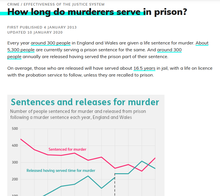 Take life sentences. To anyone not versed in it it sounds like the person is going to go to prison for life. And a lot of people think that sounds reasonable for, say, a murderer. But actually, most murderers serve 11 - 18 years in prison