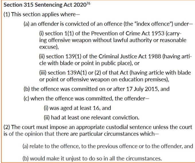 The law (Sentencing Act 2020, Section 315) says that someone convicted of knife crime must be imprisoned, unless there are particular circumstances that would make it unjust. This is commonly referred to as a mandatory prison sentence.