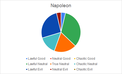 And our last individual, Napoleon. Just over half thought he was Lawful, with these splitting about 3:2 between Lawful Neutral and Lawful Evil. One person even thought he was Lawful Good (I checked to see if they were French, but remarkably not). There were also takers for Chaotic Neutral and True Neutral, and even for Neutral. For me, I think he is clearly Lawful - restoring law to France after the Terror and creating the Napoleonic Code - and while I went for Lawful Neutral, I can see the perspective that trying to conquer Europe puts one in the Evil category, even if one otherwise rules well.
