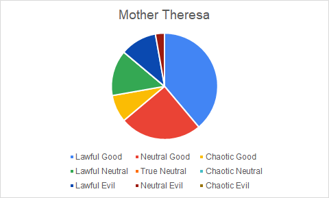 There were the results which perplexed me (I was curious as to who had put Superman as Chaotic Good; it turns out they'd also put Robin Hood, Gandalf and Harry Potter as Chaotic Good, thought they were Chaotic Good and that most people in the UK were Chaotic Good, which is at least consistent) and those which made me learn something (such as the contrarian theory that Mother Theresa is actually evil).