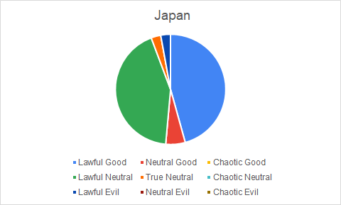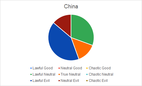 China saw a big split between Lawful Neutral and Lawful Evil, with decent minorities also going for the Neutral equivalents.