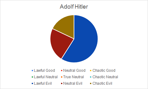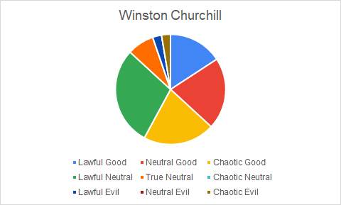 Churchill was one of the most dividing individuals, with seven different alignments selected, and no clear front runner amongst them. Just over half thought he was Good (evenly split between the three Good alignments) but the largest single category, at nearly 30%, was Lawful Neutral. A small number thought he was True Neutral, and an even smaller Evil (either Lawful or Chaotic). Interestingly, Lawful was the least popular Good alignment, but by far the most popular Neutral Alignment - most people clearly think Churchill was either Lawful or Good, but not usually both.