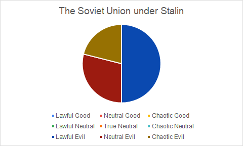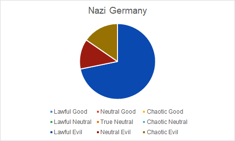 Nazi Germany was universally thought to be Evil. There was an interesting phenomenon with some people classifying Nazi Germany as Lawful Evil, but Hitler himself as Neutral or Chaotic Evil. The Soviet Union was also (reassuringly) universally thought to be Evil, but less Lawful.