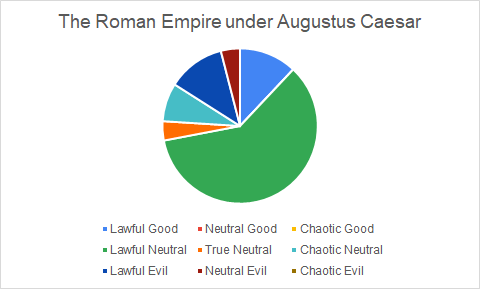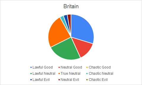 The Roman Empire was felt by a clear majority to be Lawful Neutral - I think it is a fairly archetypal nation of this alignment. A few people who did not think Britain was Lawful Good did think the Roman Empire was, which intrigued me.