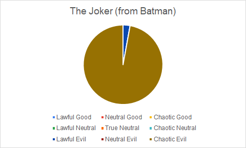 Back to archetypes, both Superman and The Joker had a clear majority for their classic archetypal answer - with the Joker being the most consistently identified in the survey, with 96% saying he was Chaotic Evil. Intriguingly, though 70% thought Superman was Lawful Good, the remaining 30% splitting across the other five non-evil possibilities.