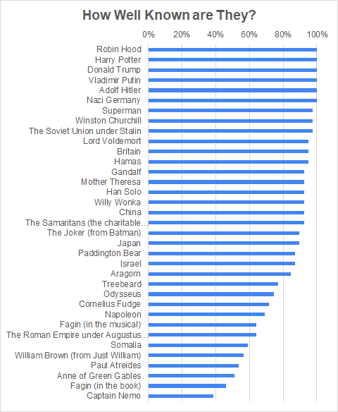And finally, which entities are best and least known? There were six figures who were well enough known that 100% of respondents could guess their alignment: Robin Hood, Harry Potter, Adolf Hitler, Nazi Germany, Vladimir Putin and Donald Trump. Superman, Churchill and the Soviet Union come close behind. In all, almost 2/3 of entities saw over 80% of people respond; after this, the answers start falling off rapidly, with Odysseus and Treebear just under 80%, Somalia, Musical Fagin and the Roman Empire near 60%, and poor Captain Nemo at only 38%.