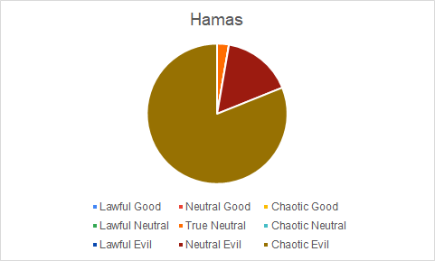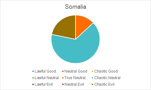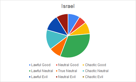 Israel, unsurprisingly, saw the most divided opinion of any question in this survey, being classed as in all eight alignments (everything except Chaotic Evil) and a good split between all of these. I was slightly surprised to see the strong showing for Lawful Neutral (I myself had put Chaotic Good), but that was still less than 30%.