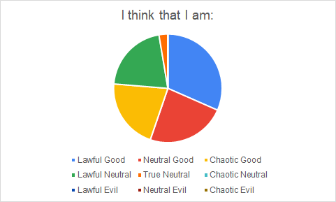 This was a primarily British audience, so I guess it shouldn't be surprising that there was a plurality for Lawful Good. Over 80% put Britain in the top left quadrant, though a few fringe voices went for Evil or Chaotic Neutral options.