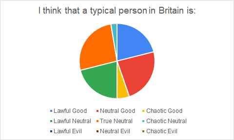 The largest single choice for a typical person in Britain was True Neutral - and yet only one person said they themselves were True Neutral! Truly, no-one is an NPC in their own life. In total, fewer than half of people thought that they were the same alignment as a typical person in Britain. Of course, sometimes this can be justified (as one person said to me, 'I think the typical person in Britain is True Neutral; but I am a lawyer, so I am Lawful Neutral') - but notably, only half of people think the typical person in Britain is Good, while three quarters of people think they themselves are3. The diversity of views on both though was interesting.