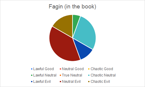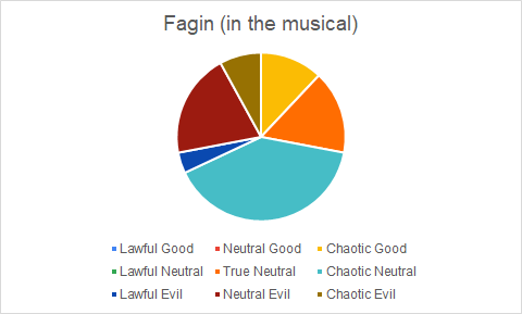 Fagin, in both incarnations, divided opinion, but he shifted from majority Evil (Book Fagin) to majority Neutral (Musical Fagin). This also saw a shift to the Chaotic, with Neutral Evil being the plurality for Book Fagin and Chaotic Neutral. A non-trivial number of people even saw Musical Fagin as actively Good.