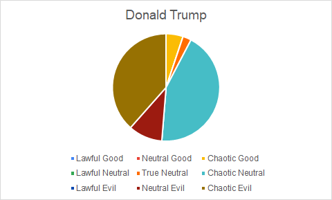 Our first real-world figure, Donald Trump, is almost universally seen as Chaotic - with Chaotic Neutral narrowly beating out Chaotic Evil. A small number go for Neutral (either True Neutral or Neutral Evil) and an even smaller number for Chaotic Good. But I'm sure he would be pleased to know that, like or loathe him, every single respondent knew who he was.