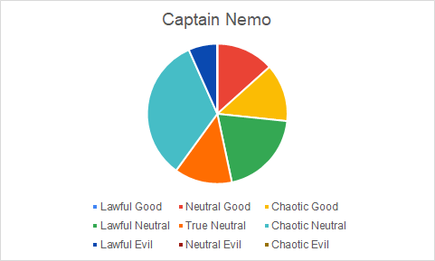 Captain Nemo greatly divided opinion. I confess to struggling with this one: I plumped for Chaotic Good when answering the survey, but on reflection think Chaotic Neutral (the plurality) is probably right.