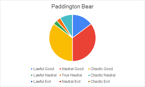The loveable bear from Darkest Peru was generally thought to be Good, and either Neutral or Chaotic. I must confess to finding it hard to understand the people who think he's Lawful (I guess he's very polite?).