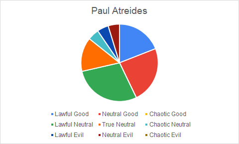 Another seven-alignment individual, Paul Atreides was generally seen as being in the top left quadrant (Lawful Good / Lawful Neutral / Neutral Good / True Neutral), but a small number saw him as Chaotic Neutral or even as Evil2.