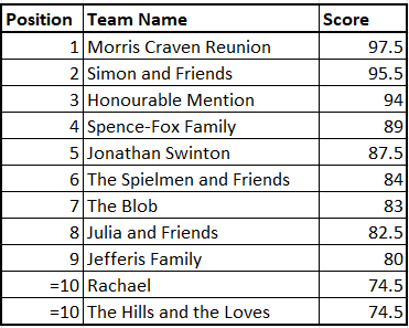 And let me say, this year was a stinker,1 with only three teams scoring in the 90s, and only eleven teams scoring above 70 (this year’s threshold for the Honour Roll). So congratulations to everyone who made it on to that esteemed list - and to all the rest of you quizzers who puzzled away on it: a score in the 50s or 60s, is more like getting in the 70s or 80s in a normal year.2