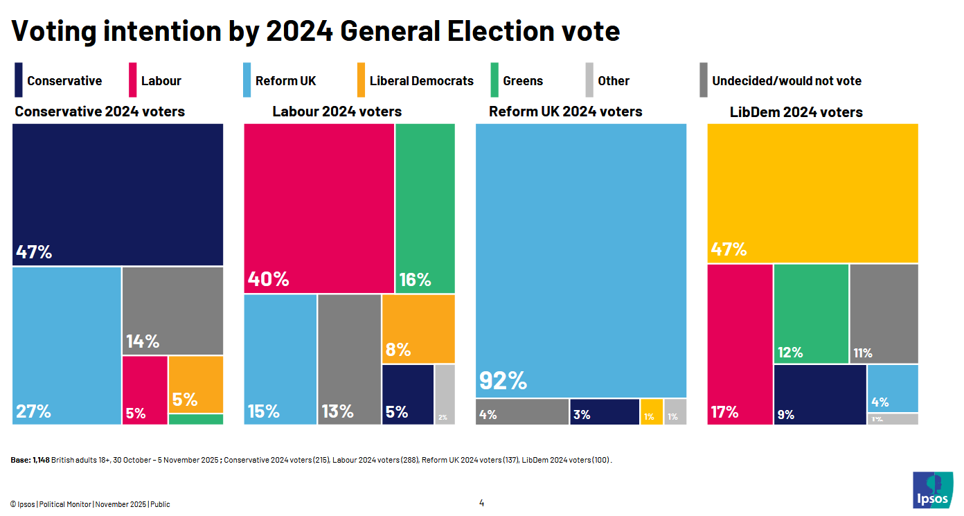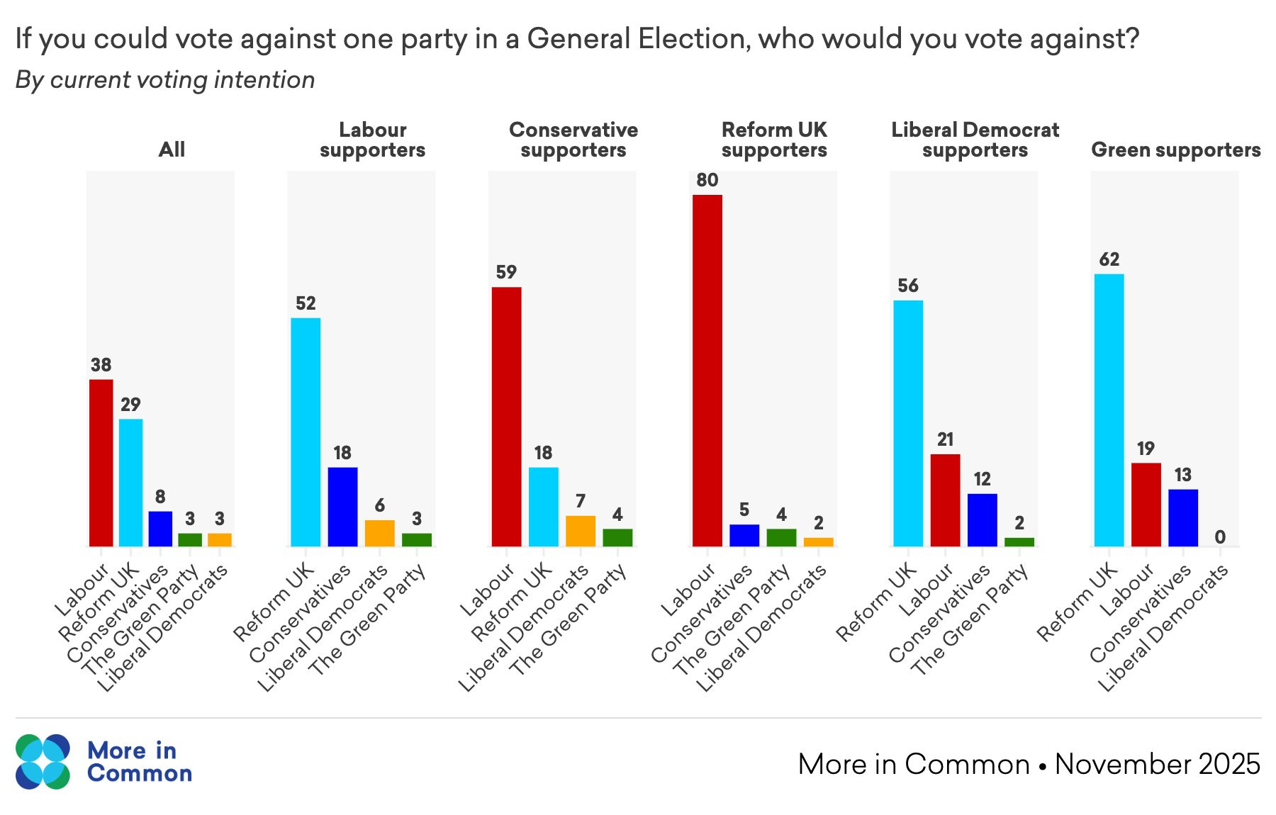 Therefore, political parties should focus on taking voters off the other parties in their bloc, not attacking the other bloc. In particular, that Labour should focus on reclaiming votes lost to the Lib Dems and the Greens, and also that the Conservatives should focus on attacking Reform.