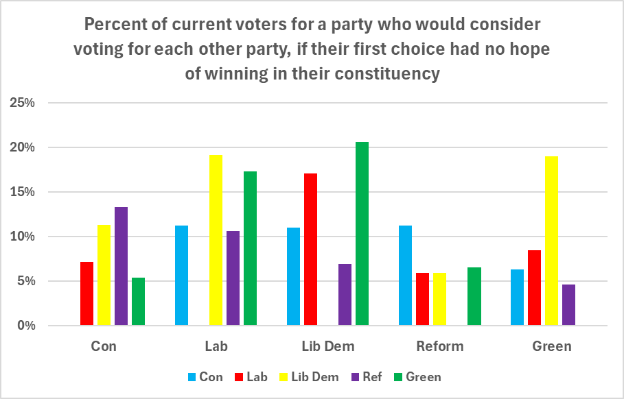 Well, bloc politics isn’t perfect. It’s hard to say for certain which other parties someone might switch to, but Opinium did a poll earlier this month where they asked which other parties people would consider voting for if they lived in a constituency where their first choice had no chance of winning.3