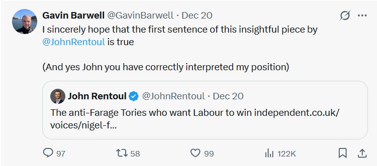 Lord Ashcroft also did a poll last week, in which he found that “Supporters of left-wing parties overwhelmingly say another party of the left would be their second choice. But one third of Reform voters would vote for a non-Tory if Reform weren’t standing, and more than half of current Conservatives name a party other than Reform as their second preference.” The poll got results quite out of line with the polling average on headline voting intention, including Reform on 25 and Conservatives on 22, 4 points ahead of Labour on 18 - so I’m not sure how reliable it is.