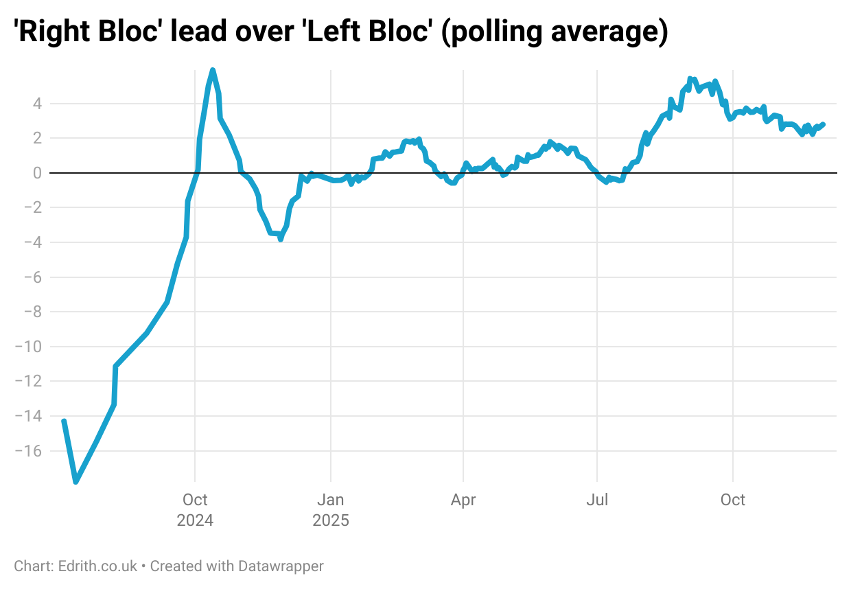 The Election Maps poll of polls similarly puts the right bloc about 2.5 points ahead, while the Politico poll of polls puts them level, but hasn’t been updated for a week.