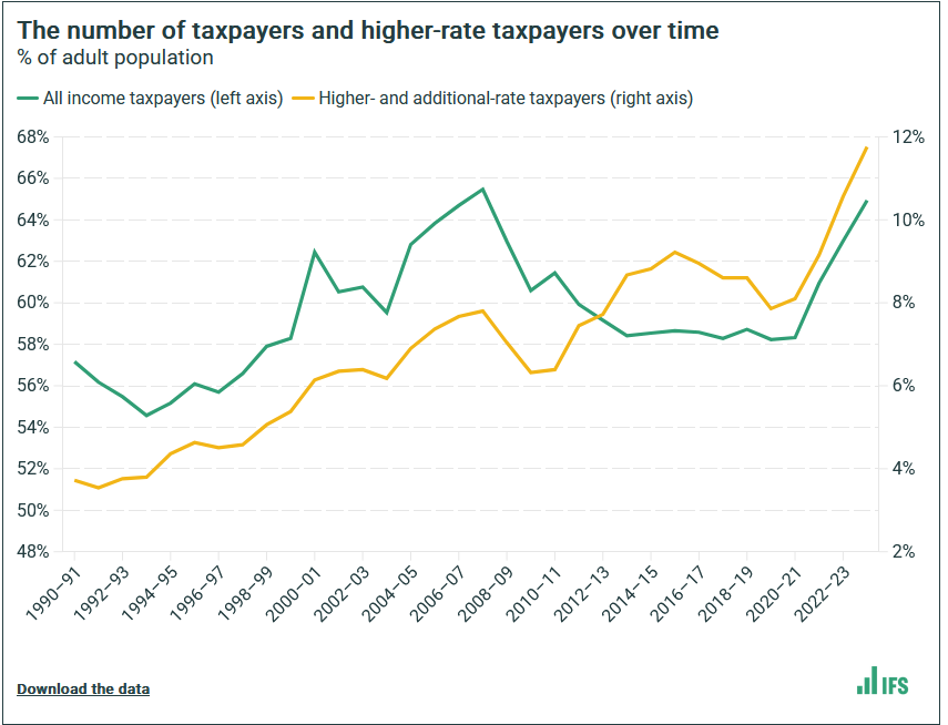 Following the reforms, more than 40% of adults were not paying any income tax at all. This is now down to just over a third - a much healthier state of affairs, and it is no coincidence that the pendulum on tax cuts vs tax rises has swung back as more people are dragged into the tax system. As someone who believes high taxes are economically damaging9, a broader base so that more people can directly feel the impact of higher public spending would be both beneficial and fairer.
