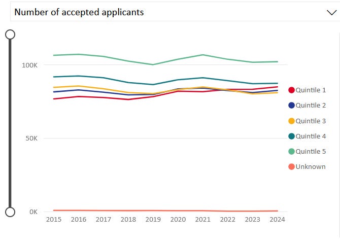 Now, the top do pay some price here - but if we look at the stats, we see it is the middle who have paid the highest price. The chart below shows that those from the most disadvantaged quintile (quintile 1) are now more likely to be accepted than quintile 2 or 3, and almost as quintile 4 - but the significant gap between quintile 5 and 4 is just as big as it was ten years ago.