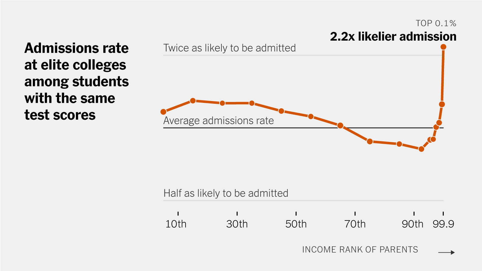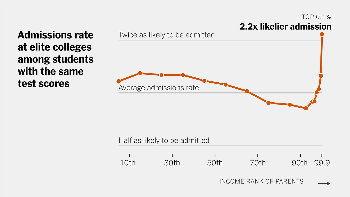Here’s a chart that did the rounds last year, showing the chance of getting into elite US universities, such as Harvard, by parental income - after controlling for test scores: