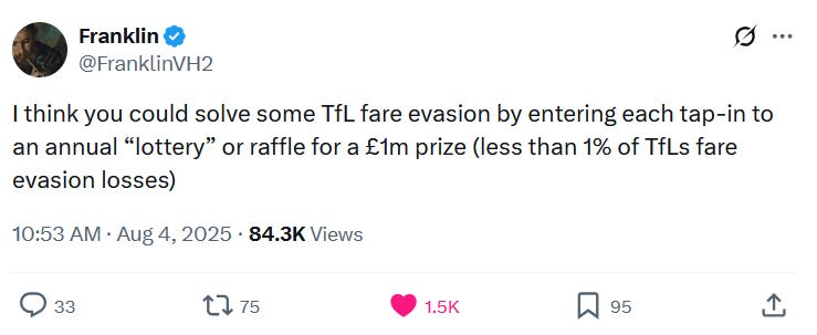 That’s 432 winners a year, for a total of £1.5 million - which is still well under 1% of TfL’s losses due to fare evasion. Over a five year period, and using Dunbar’s number3 as a proxy, roughly 1 in 30 Londoners will personally be acquainted with someone who’s won.