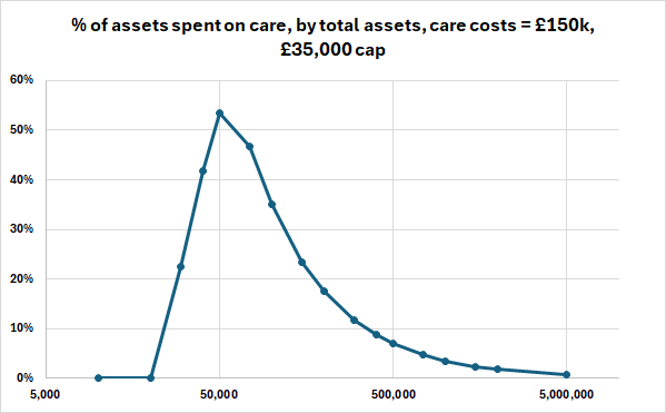 The £35,000 cap makes a big difference. It shifts the peak leftwards, from c. £175,000 to just £50,000, and it also lowers it a lot, from c. 85% of assets to c. 55% of assets. Those with median assets of c. £300,000 see the share of their assets spent on care drop from 50% to just 23%.