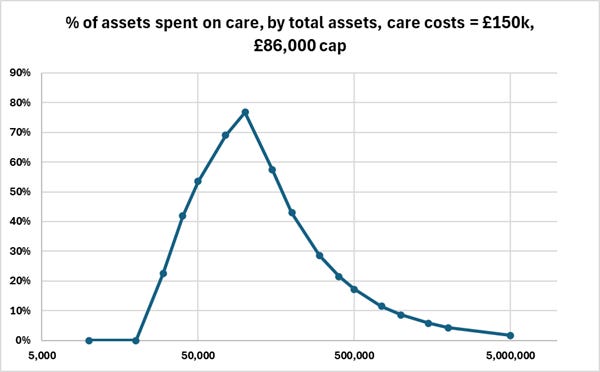 The £86,000 cap, on the other hand, is rather different. The peak also shifts leftward, though less dramatically, but stays high, at just under 80%. Those with with median assets of c. £300,000 still see the share of their assets spent on care drop significantly, from 50% to just 29%, but those assets below about £150,000 see little benefit. It also - obviously - wouldn’t make any difference to anyone who spent less than £86,000 on care, which may be quite a few people.