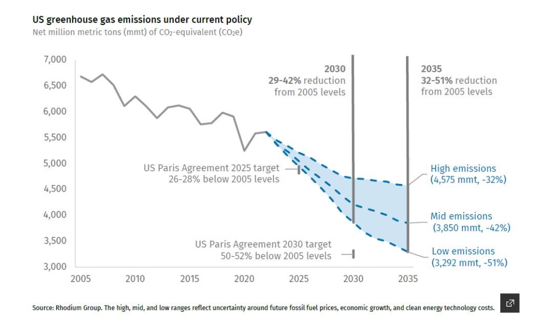 Through the IRA and other policies, he’s followed a strategy of energy abundance - both increasing oil and gas production to record levels (the US is a net exporter of oil and gas now) and, as described above, pouring hundreds of billions of dollars into subsidising renewables, meaning that carbon emissions are falling significantly. Together, that does three things: it keeps America’s economy strong (cheap energy → economic growth); it weakens the global power of petro-states, including Russia and OPEC nations; and it helps the planet - because those renewables are steadily displacing fossil fuels (carbon emissions were down 1.9% last year, while the economy grew by over 2%), even as domestic fossil fuels have displaced imports.