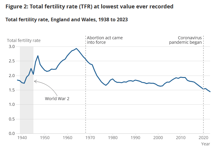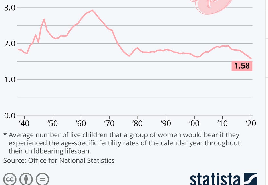 What does seem likely is that societies, cultures and sub-cultures who solve this problem will continue - and those who don’t, won’t. On current trends, South Korea and Japan will effectively cease to exist as viable countries within the century.23 For us in England, like the elves we have a little longer to linger and fade, at least for now24 - though based on the last decade’s fall in TFR, we should not count on that to last.