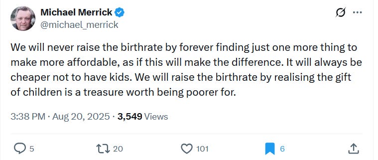 There is always a danger that those suggesting how to increase the birthrate simply push the political agenda they had already. Make houses cheaper! More parental leave! More free childcare! Smash patriarchy! Stop women working! Abolish capitalism! Less regulation!