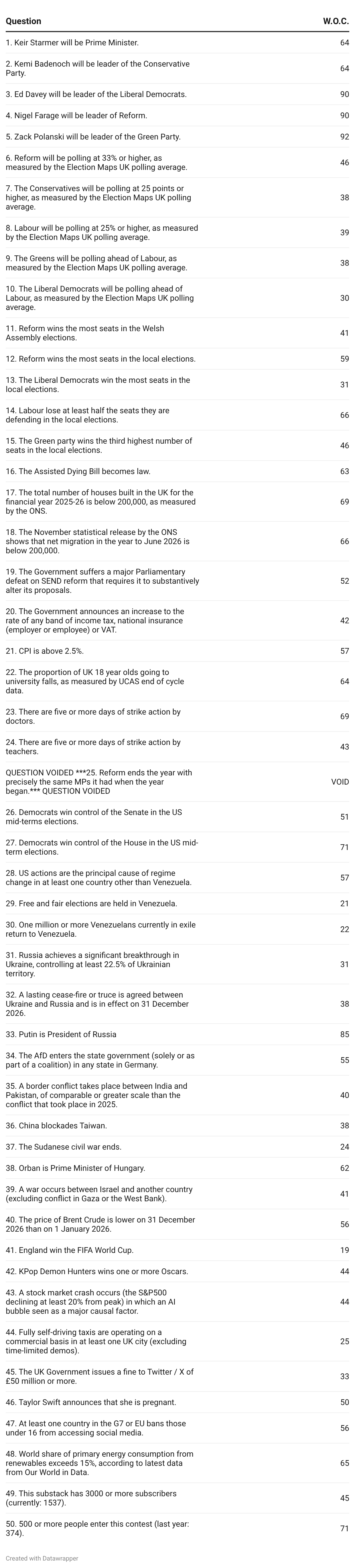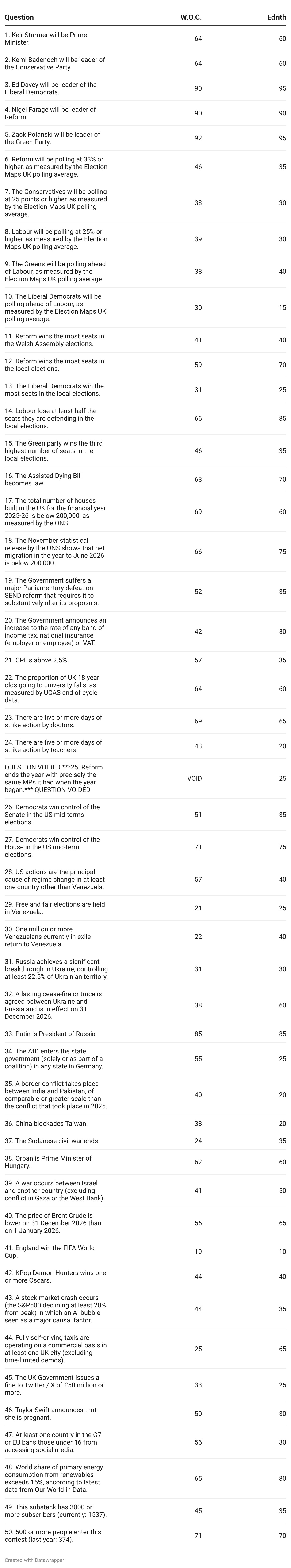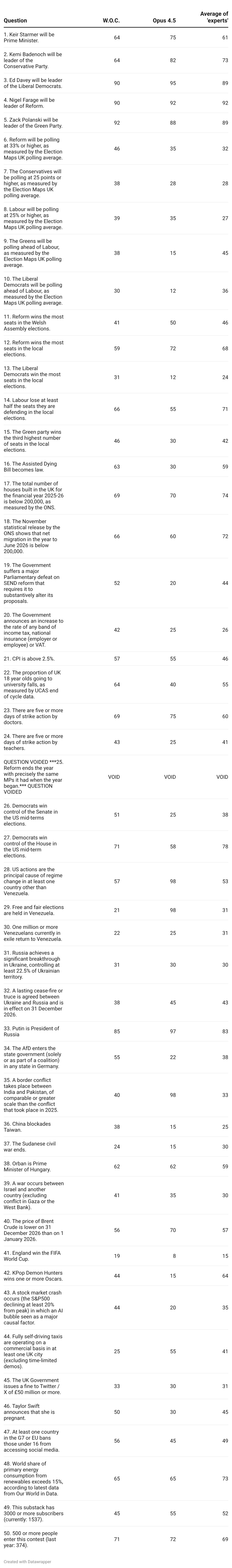 To look at two other forecasts of possible interest, reader Chris again used an AI - this time Opus 4.5 - to generate predictions.3 Last year the AI got a Brier score of 0.222 which would have put it 136th (35th percentile) - so better than the median human but well below the top performers. I must admit I think its forecasts this year look highly dubious, but its reasoning can be found here.