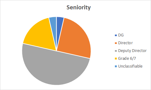 What about seniority? It should be noted that when it comes to people working outside the civil service, I have had to make my best estimate of an equivalent seniority from the description of the role in LinkedIn3; it is, clearly, impossible to make perfect comparisons, but I do not think I am wildly wrong.