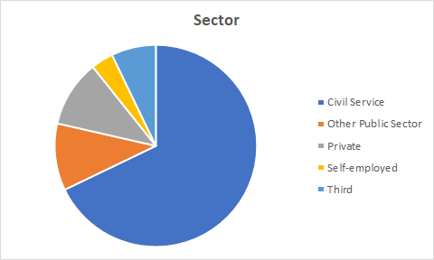Both the median and modal result was Deputy Director, the first rung of the Senior Civil Service. Of course, it is possible, indeed likely, that many of these people could be promoted further over the next twenty years. One person has already made it to Director-General - pretty impressive for under twenty years, and they are no doubt in the pool of potential future Permanent Secretaries. Just over another 20% are at Director level or equivalent. Meanwhile 1 in 6 are at Grade 6 or 74.